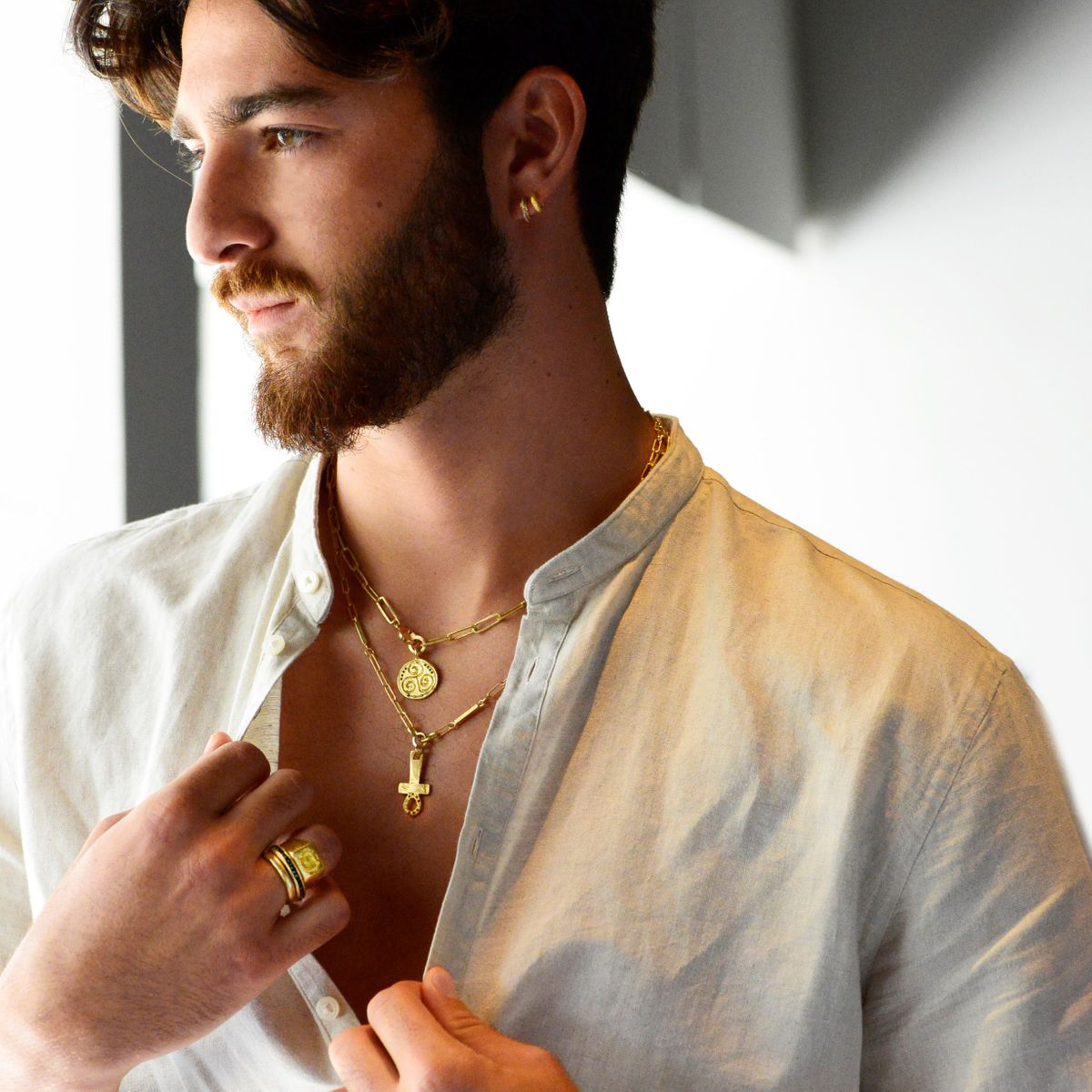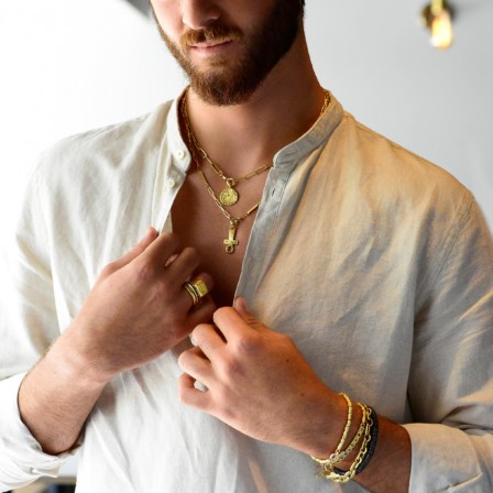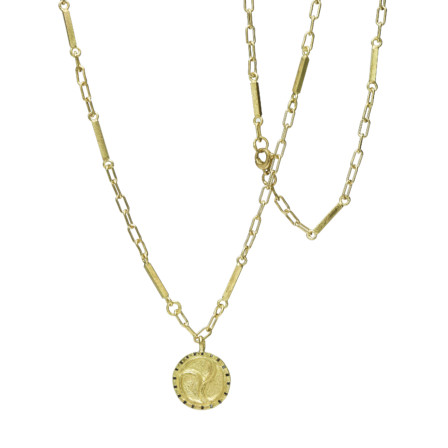 18k Gold chain of rectangular links and delicate bars, with round pendant