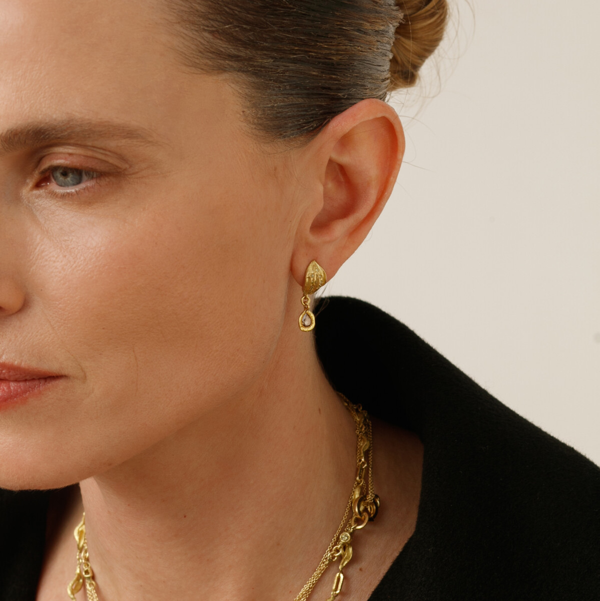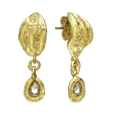 18K Gold grooved stud earrings with a Champagne diamond slice