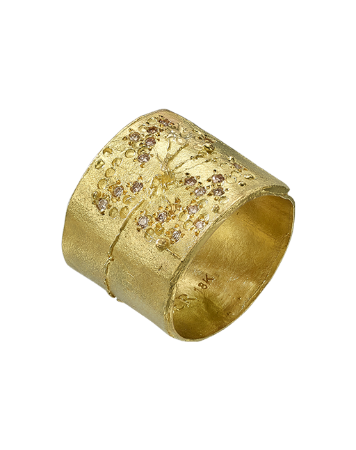 18k Gold flowers imprinted ring with a white diamond