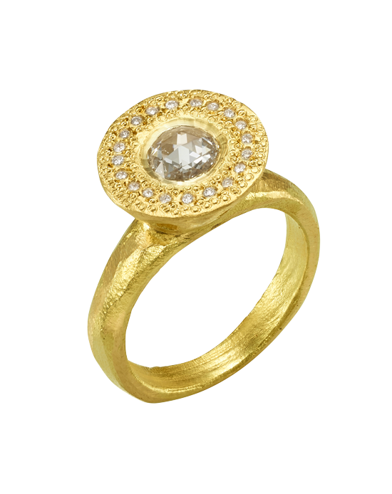 18k Gold hexagon ring with a sliced white diamond