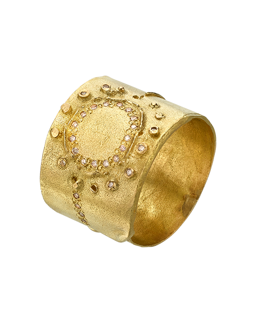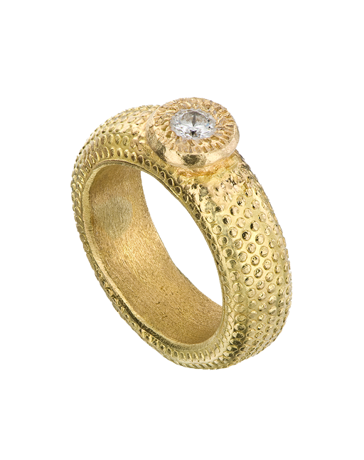 18k Gold broad dots textured ring with a white diamond