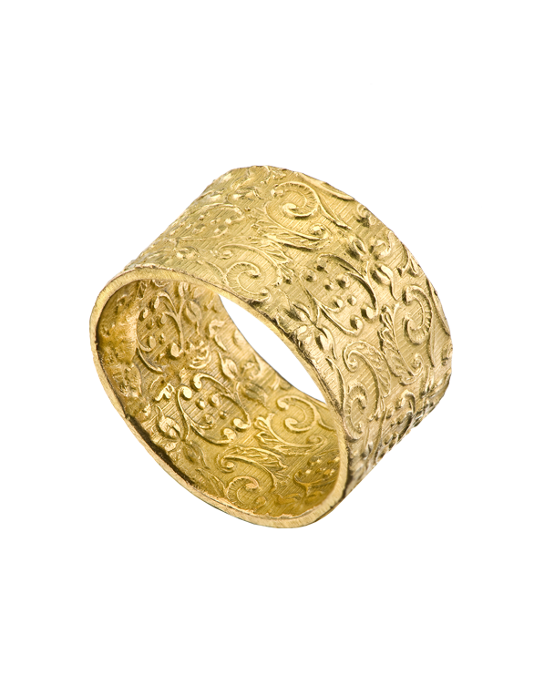 18k Gold wide floral imprinted wedding band