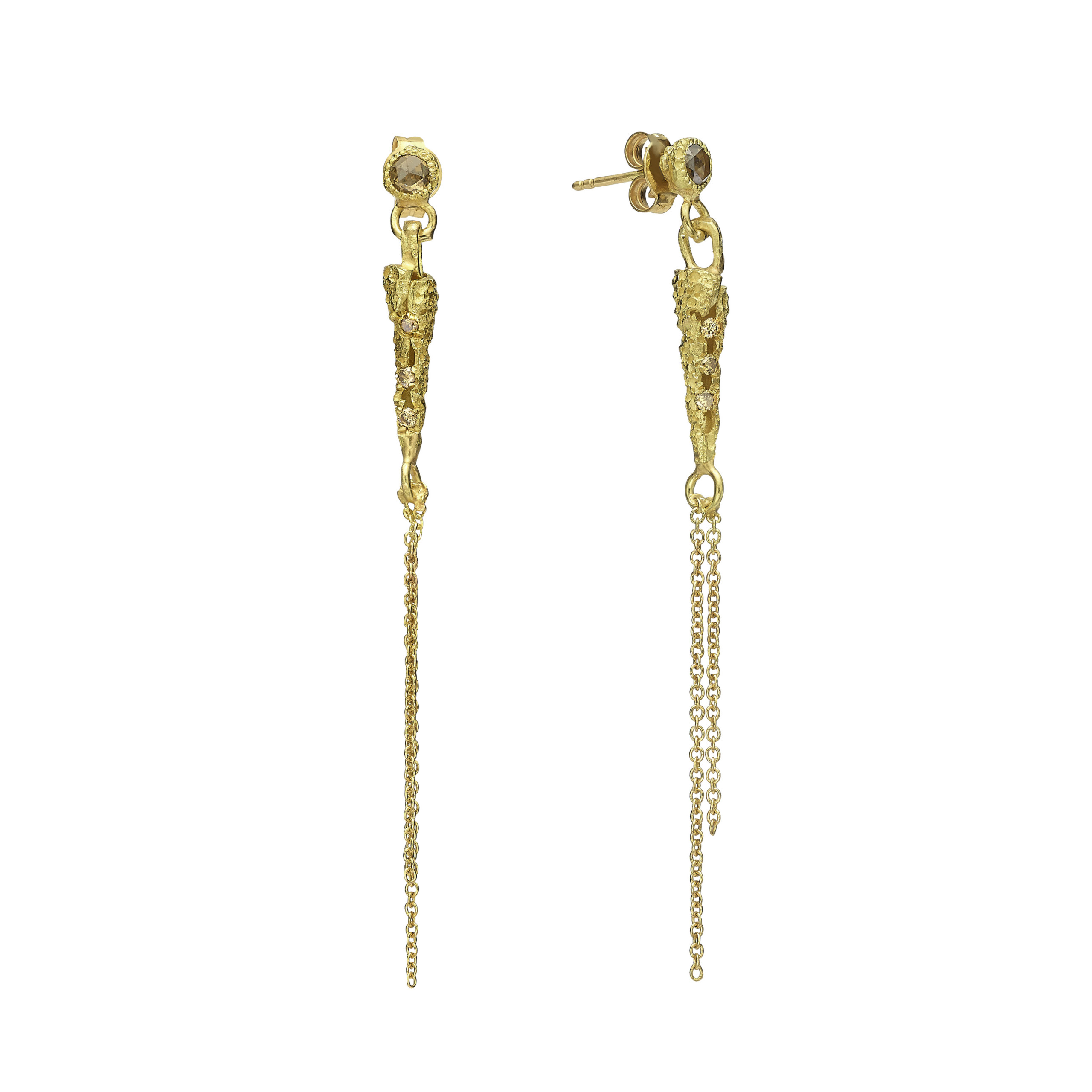 עגילים צמודים זהב 18 קראט עם תליון קונכיה וגדילים