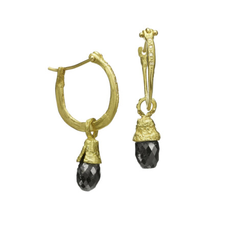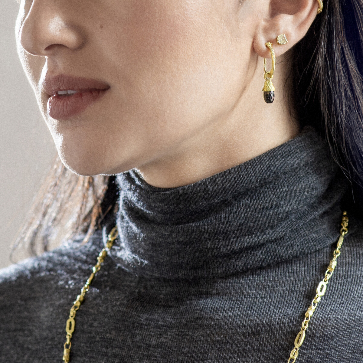 עגילי חישוק דקים גדולים זהב 18 קראט עם יהלום שחור גולמי