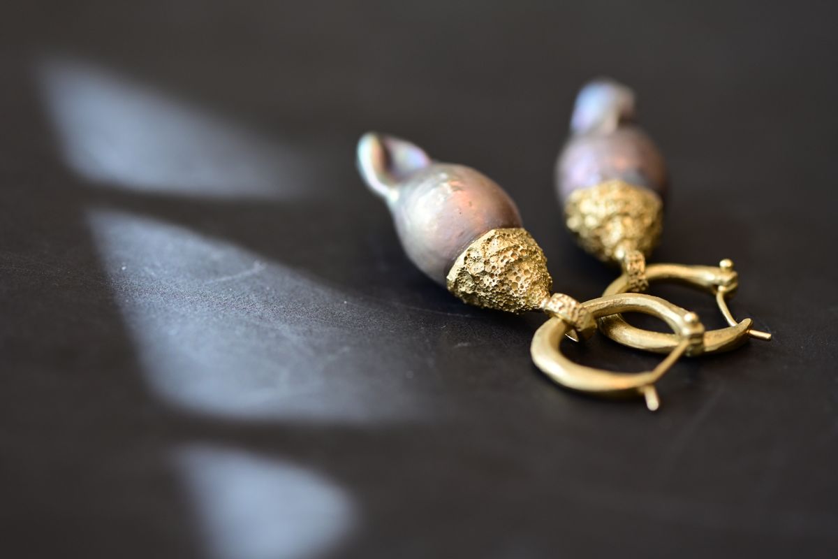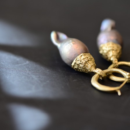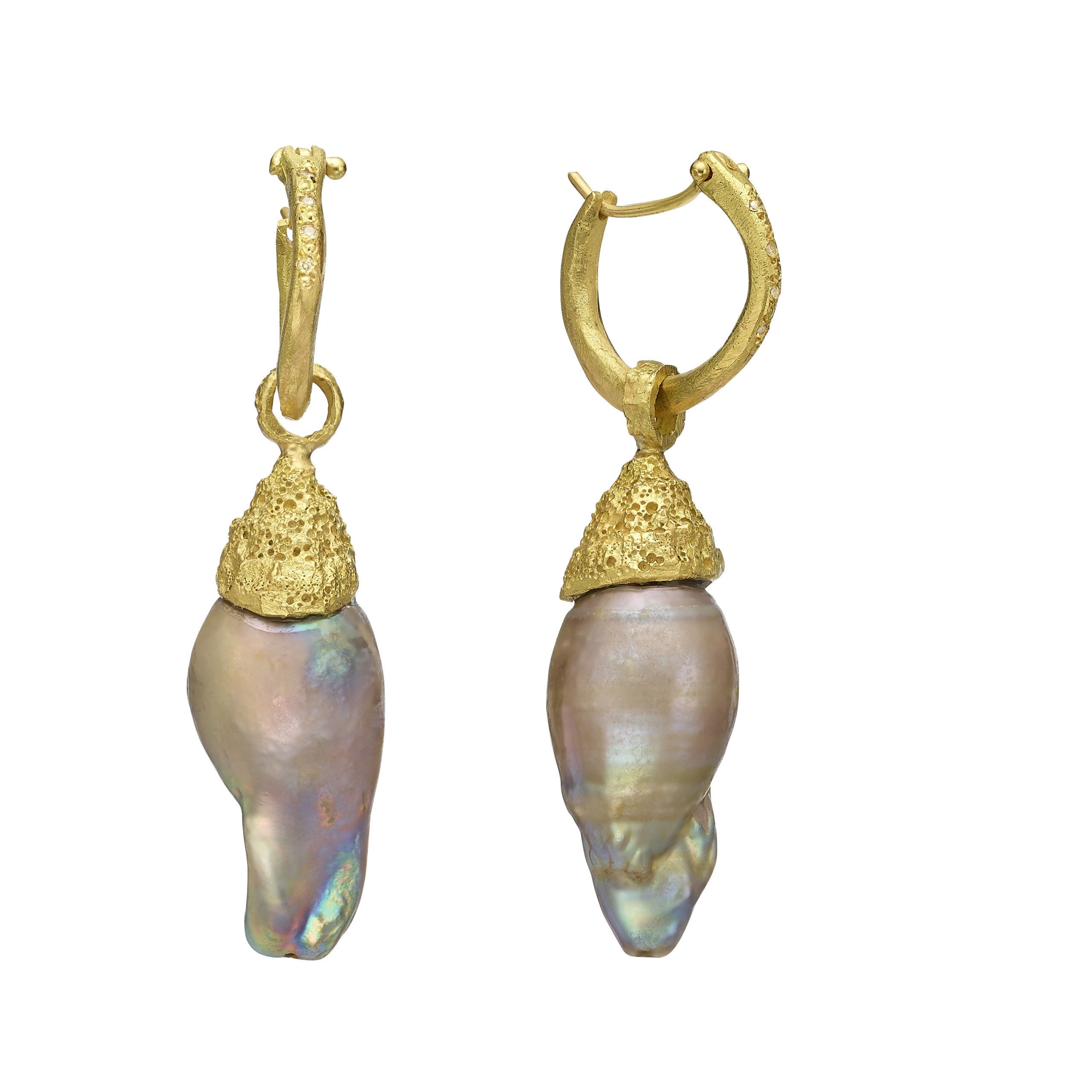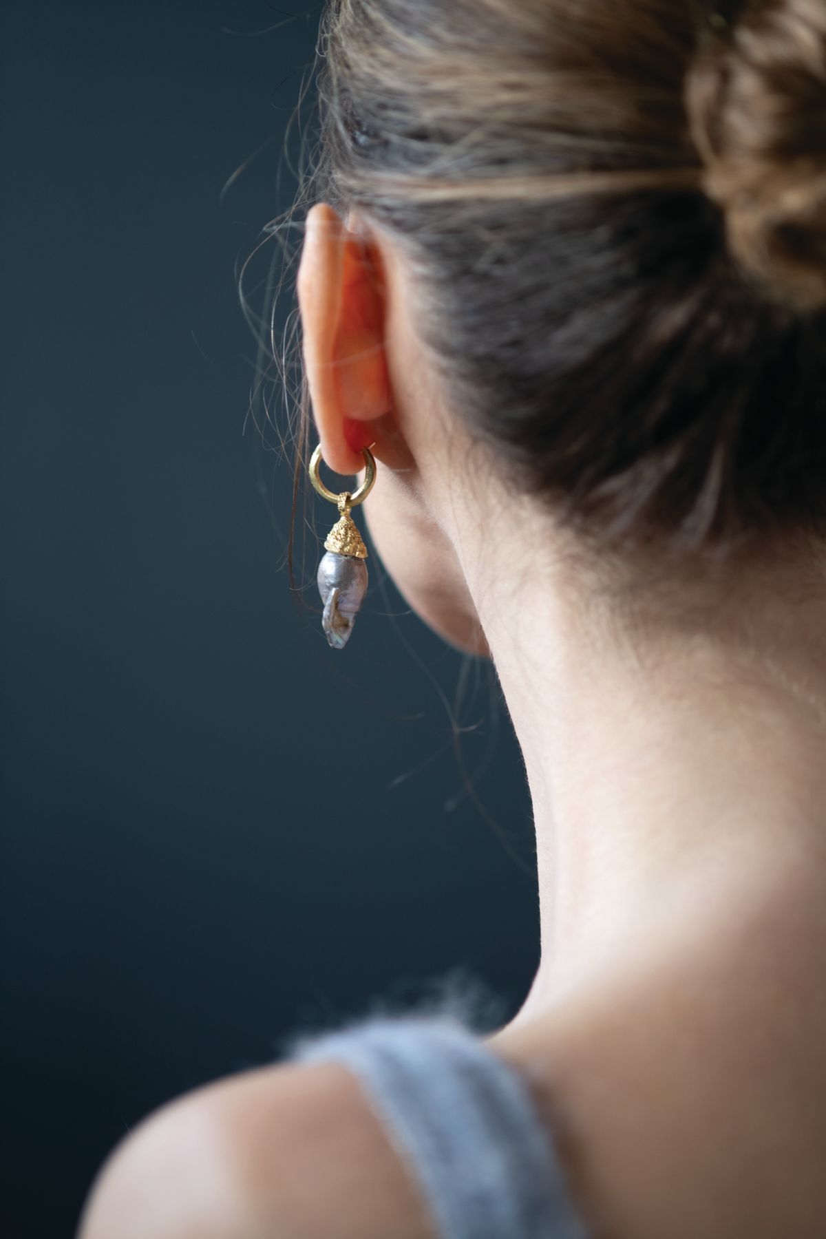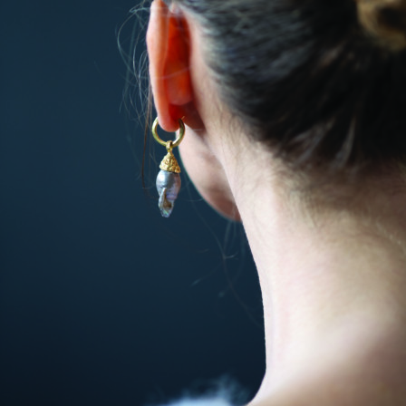 עגילי חישוק חלקים גדולים זהב 18 קראט עם תליון קונכיה ופנינה