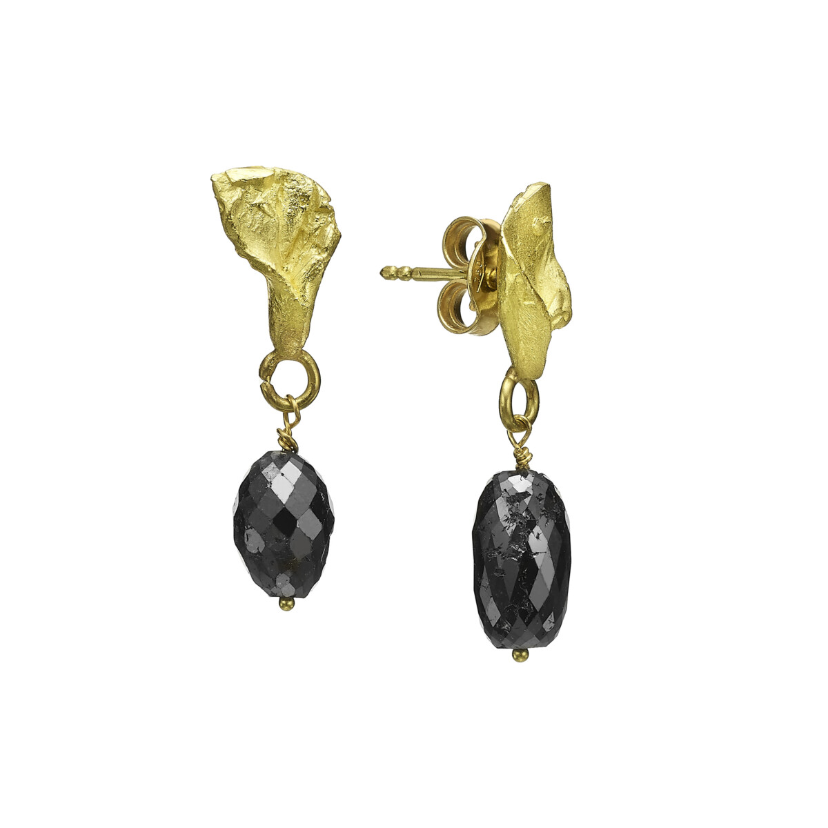 עגילי עלי זהב צמודים 18 קראט עם יהלום שחור גולמי