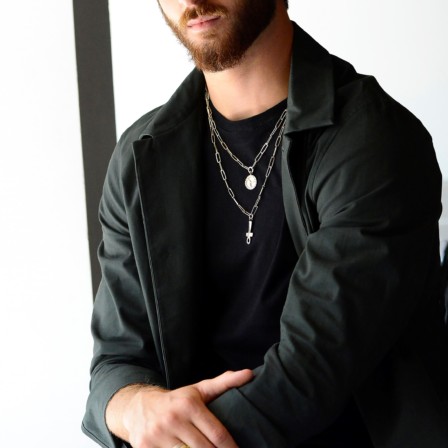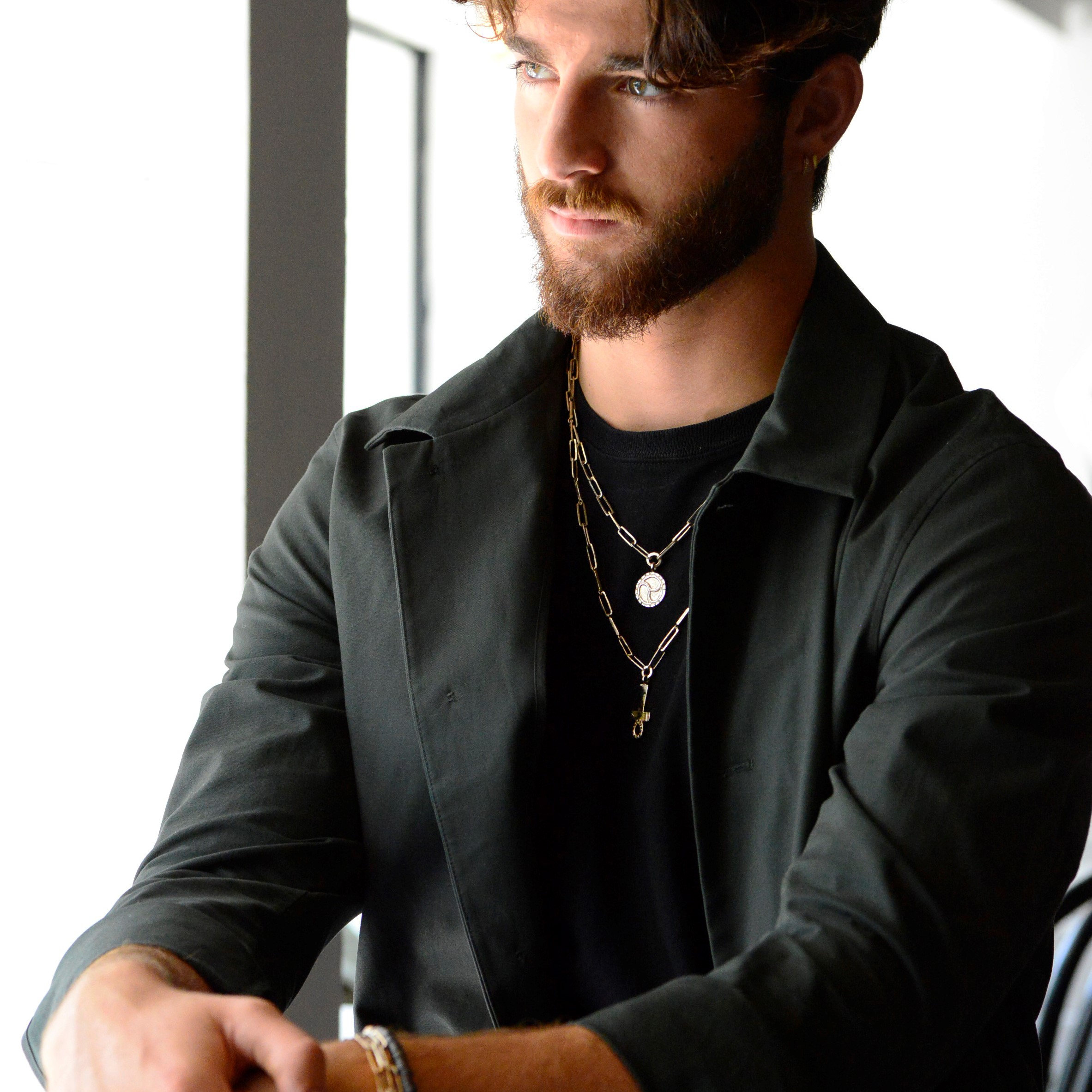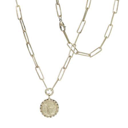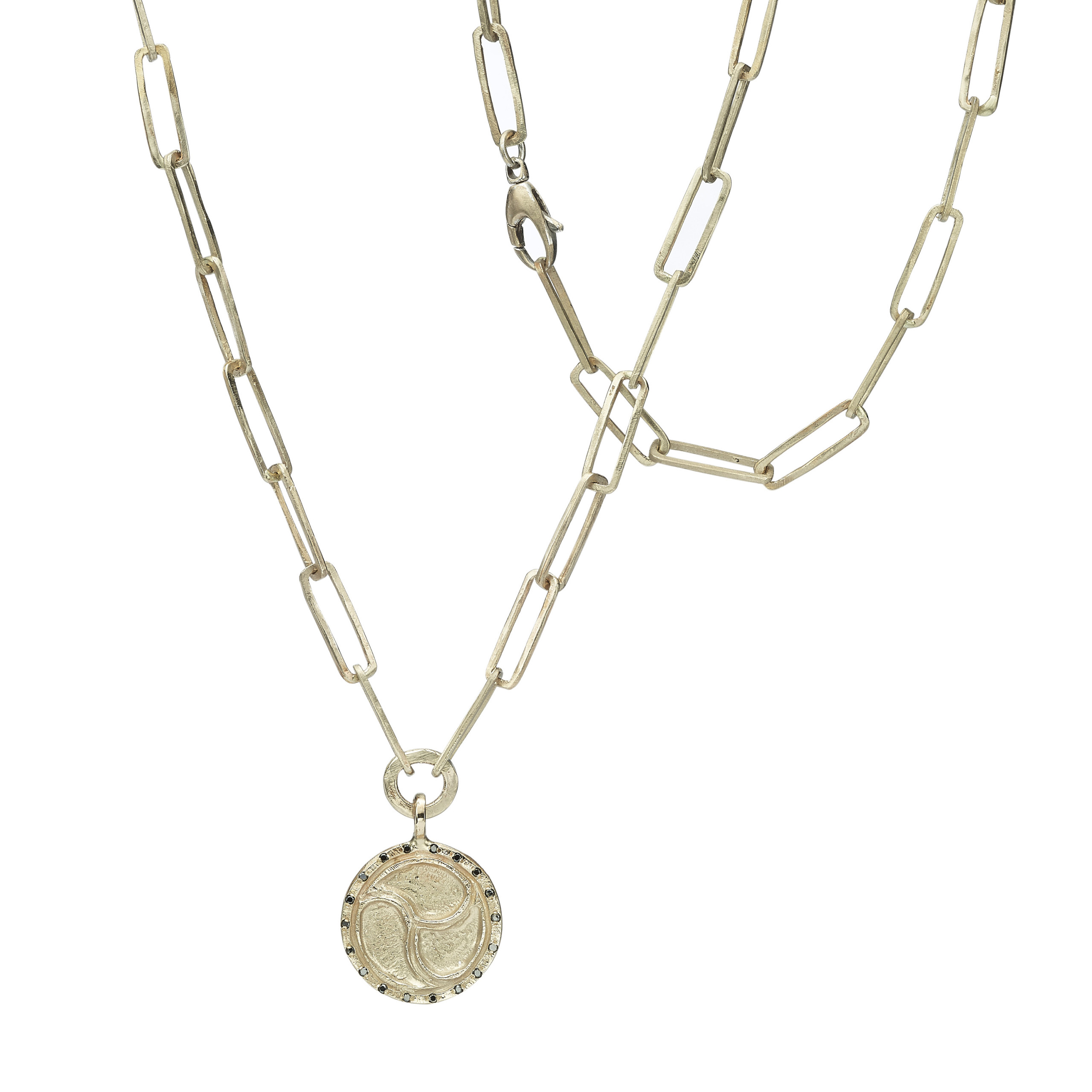 שרשרת זהב לבן חוליות מלבניות עם תליון עגול משובץ יהלומים שחורים