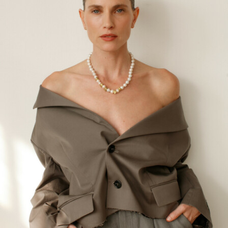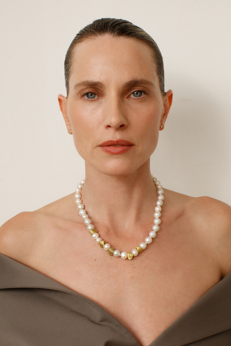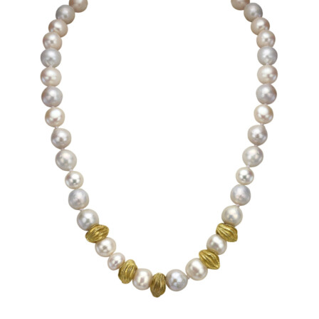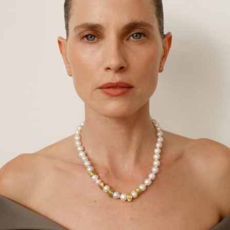 שרשרת פנינים עם כדורי זהב 18 קראט מחורצים