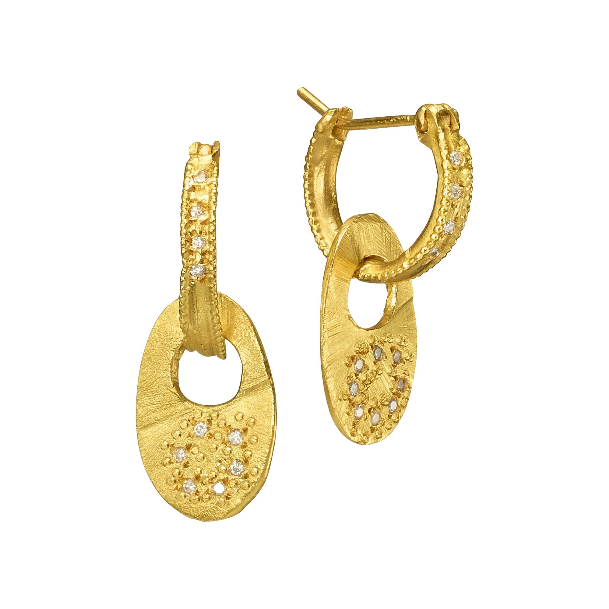 עגילי חישוק זהב 18 קראט עם תליון פלטה מאורכת
