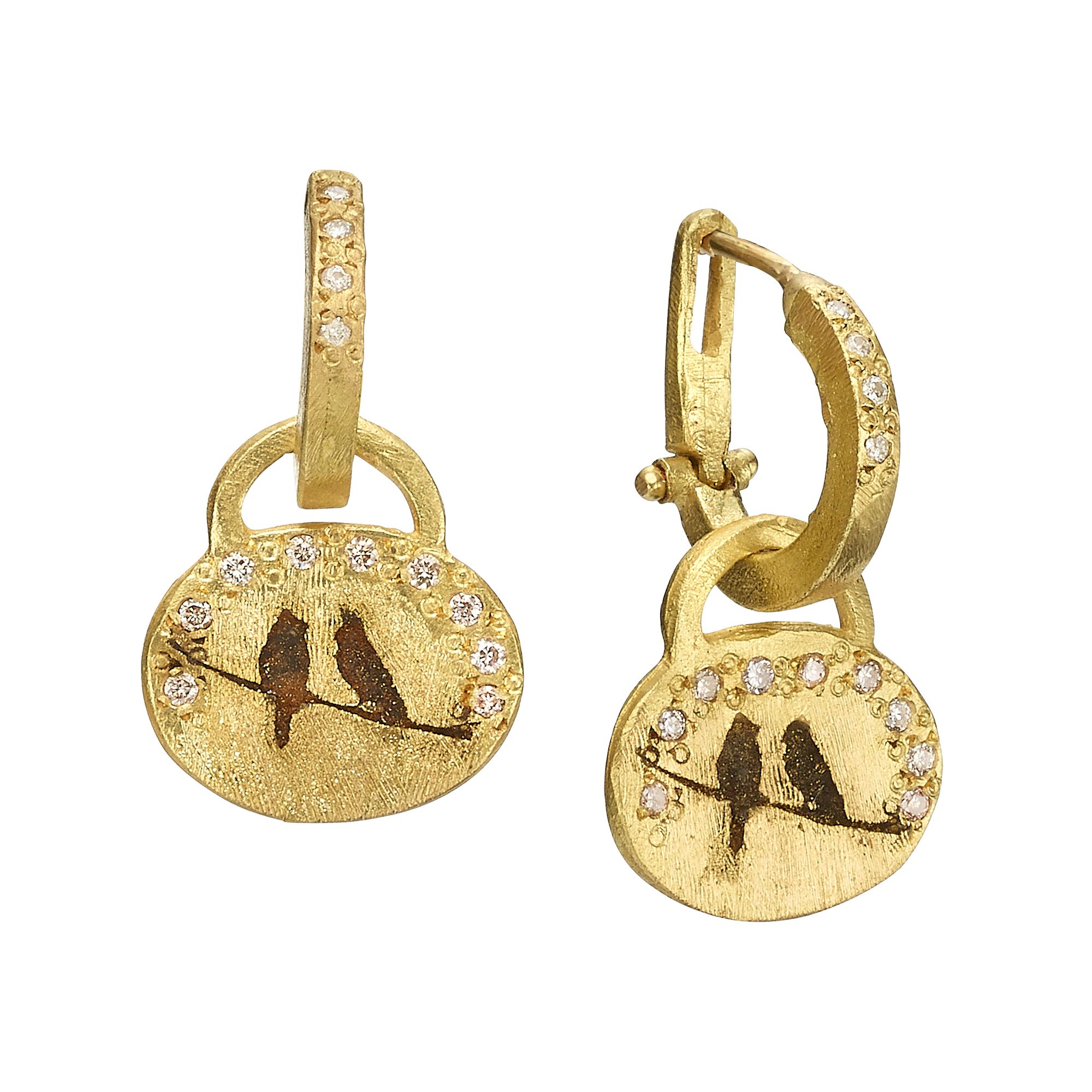עגילי חישוק זהב 18 קראט עם תליון בחריטת ציפורים