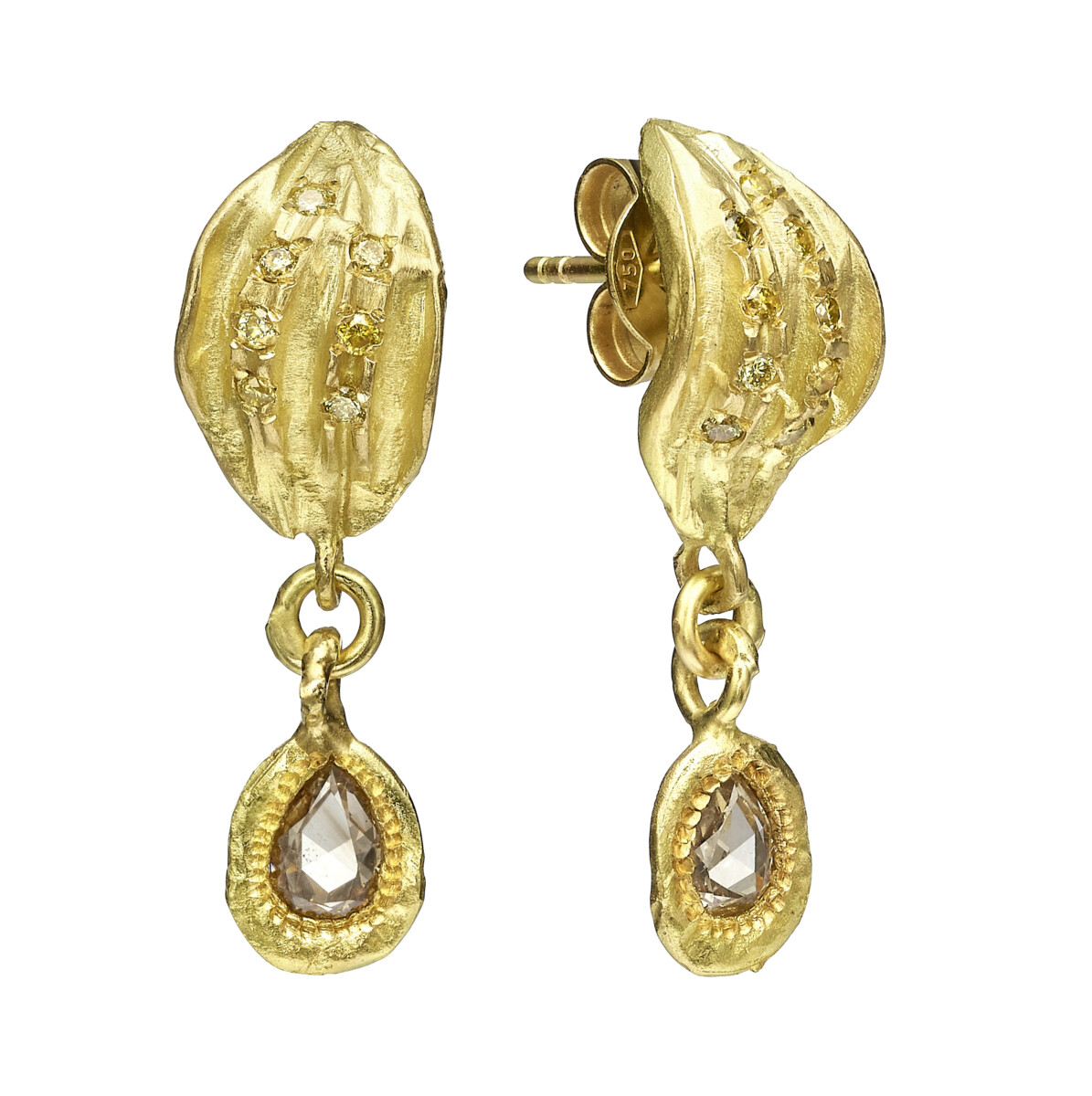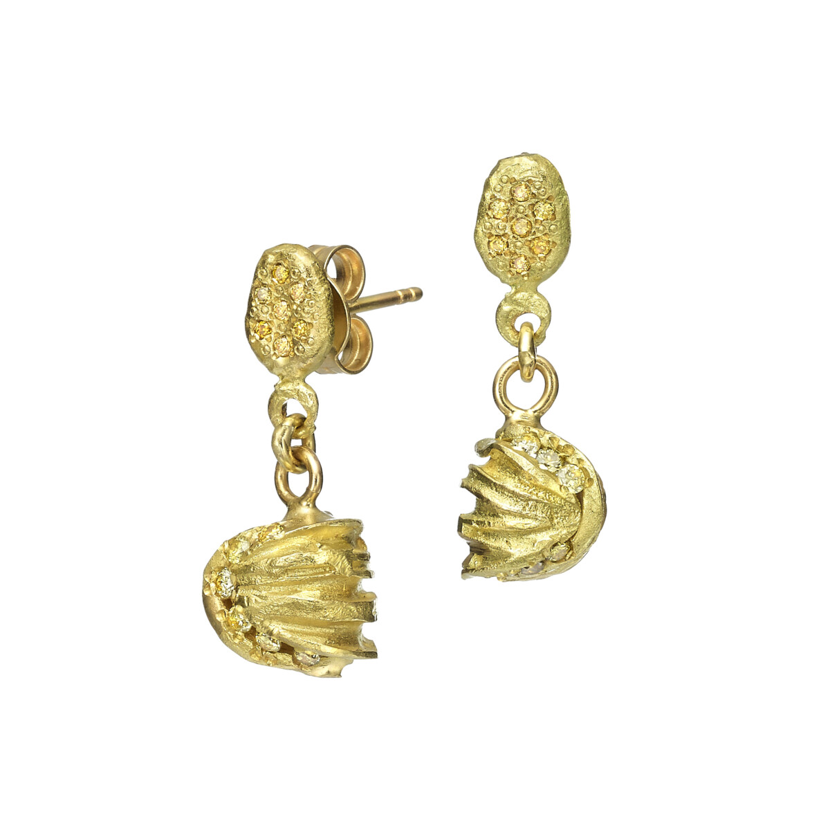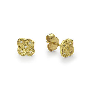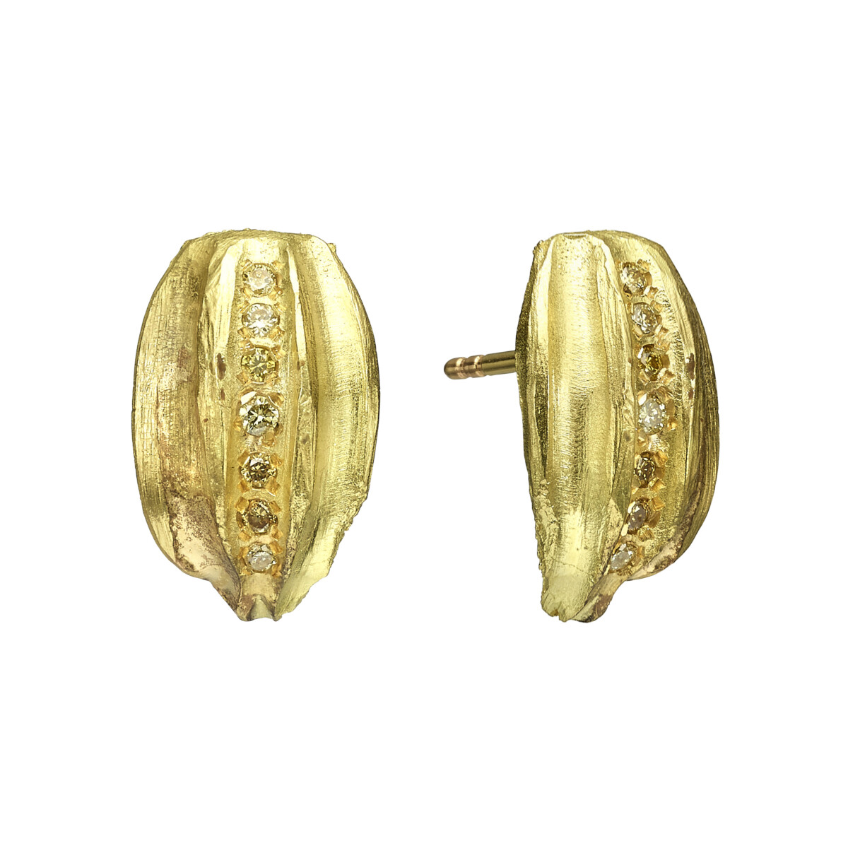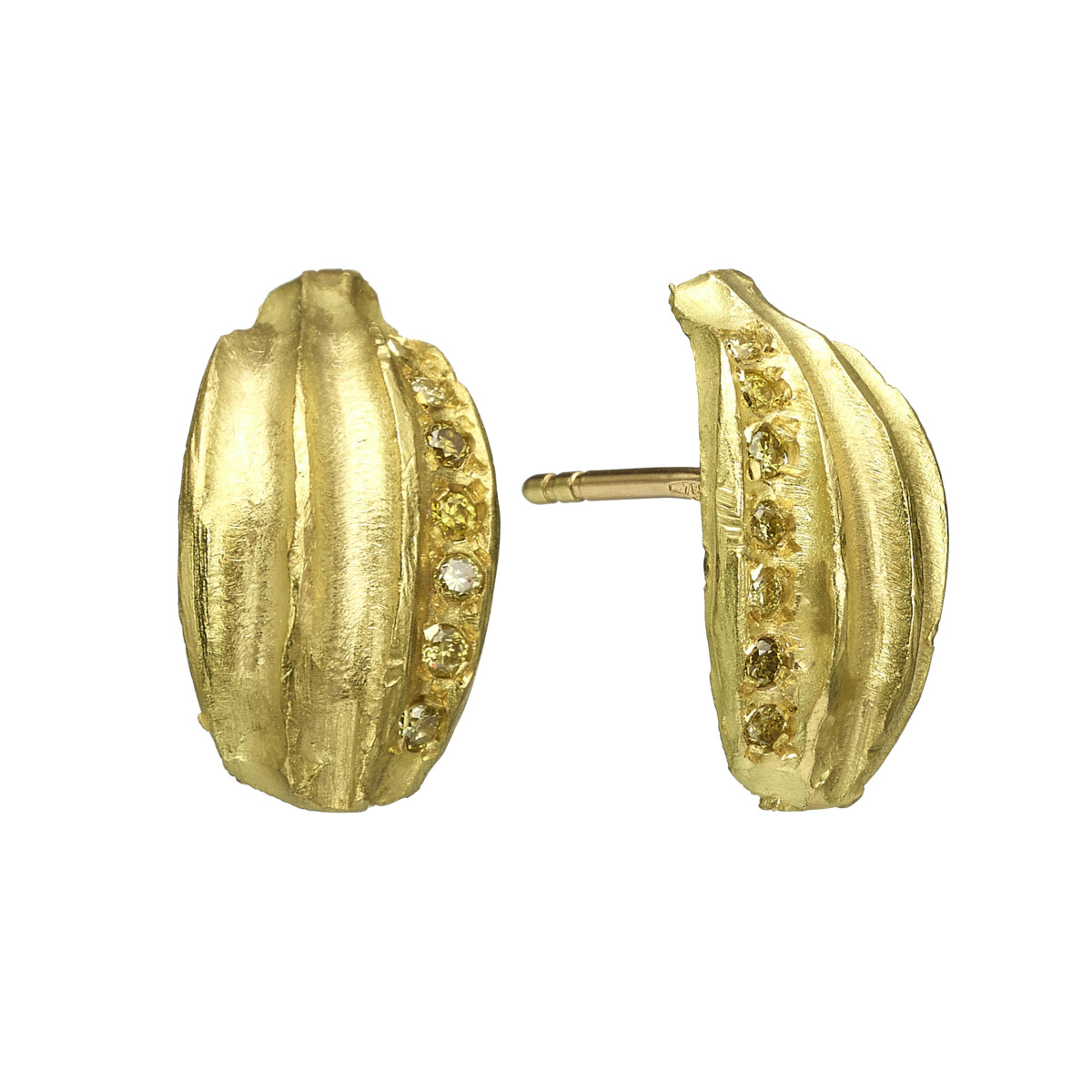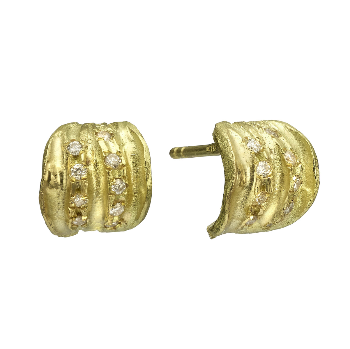 עגילי זהב צמודים מחורצים 18 קראט עם פרוסת יהלום שמפניה