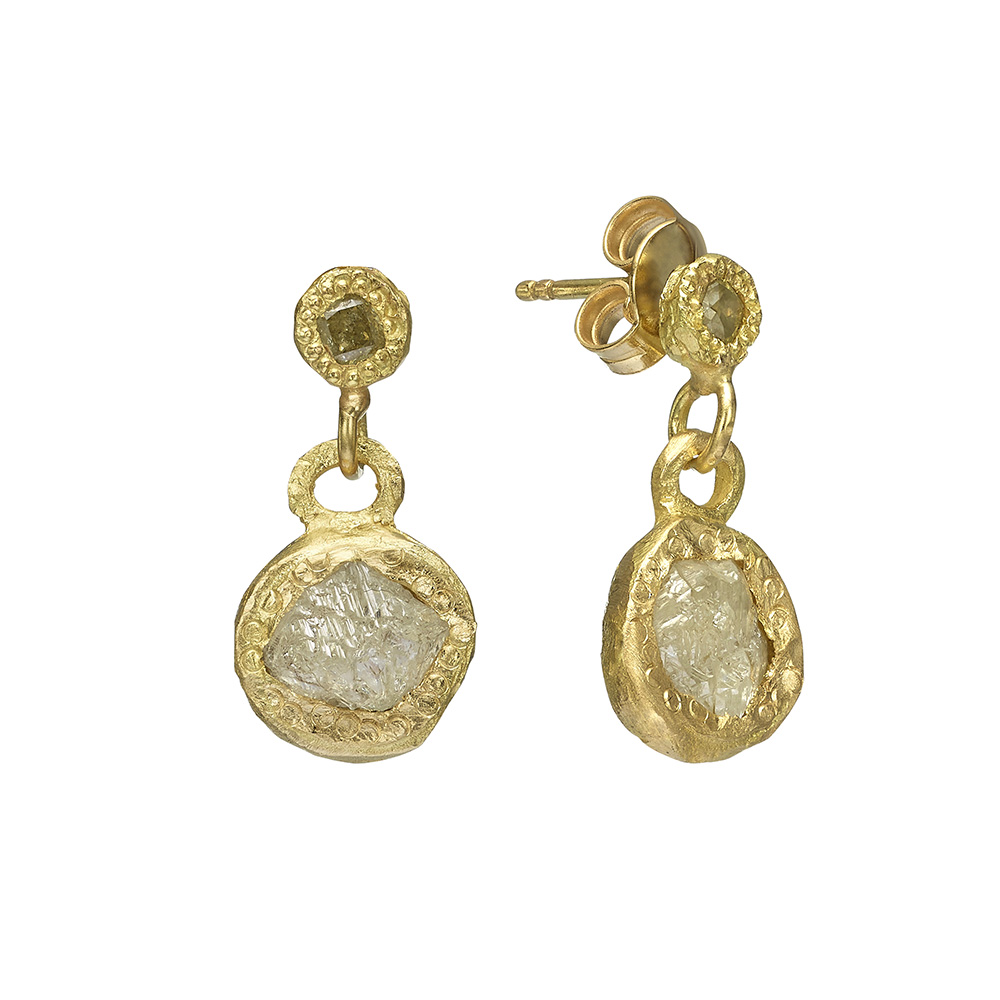 עגילי עלי זהב צמודים 18 קראט עם יהלום שחור גולמי