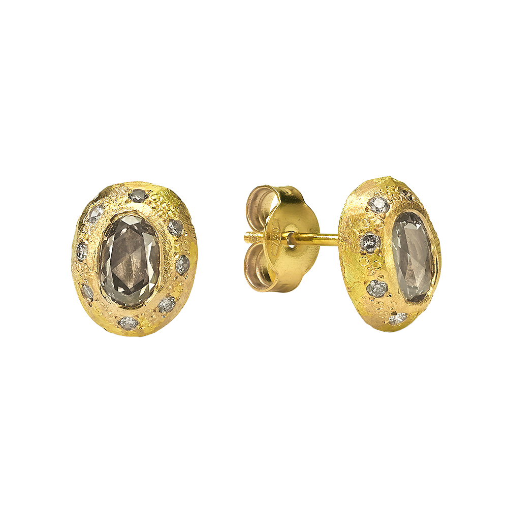 עגילים צמודים זהב 18 קראט עם פרוסת יהלום ורוד