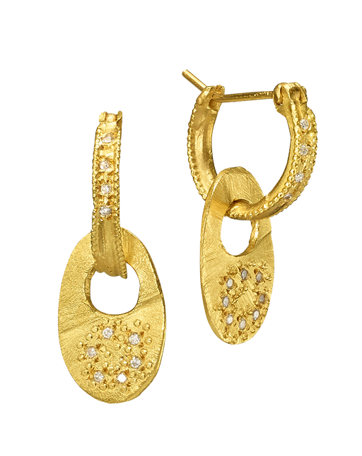 עגילי חישוק זהב 18 קראט עם תליון פלטה מאורכת