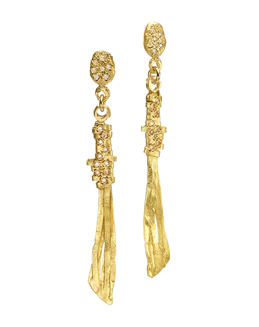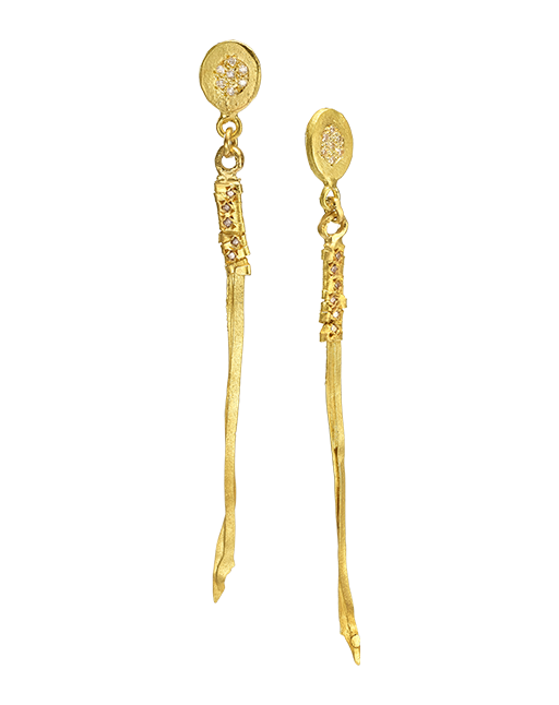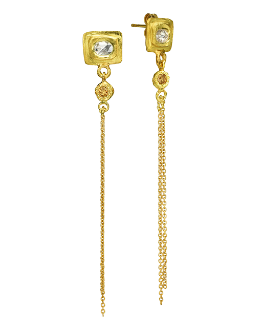 עגילי גדילי זהב 18 קראט עם תליון פרוסת יהלום ויהלום שמפניה