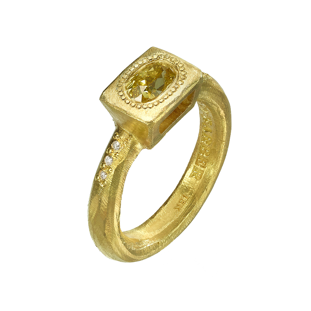 טבעת חישוק עבה זהב 18 קראט עם יהלום שמפניה מלבני