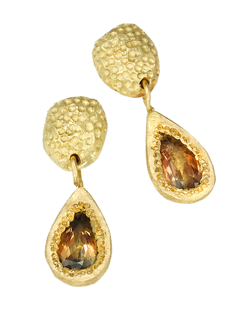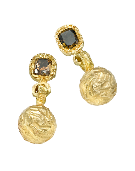 עגילי זהב 18 קראט עם יהלום שמפניה וכדור מפוסל